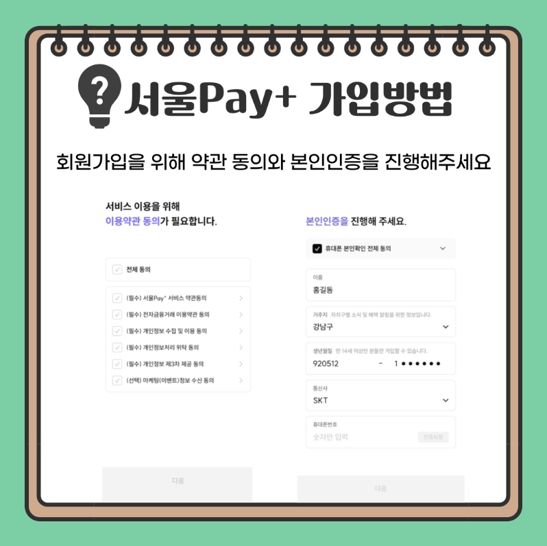 서울페이 홈페이지 접속 후 휴대폰 번호로 회원가입을 진행합니다. 본인인증은 휴대폰 인증 또는 공동인증서 둘 중 하나를 선택할 수 있으며, 휴대폰 인증이 더 빠르고 간편합니다.